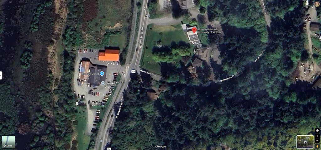 - So Where is the Unitarian Universalist Community Of Victoria Building: 5575 West Saanich Road, Saanich BC. Drive out West Saanich Road and just past the Red Barn Market, turn right after Matterhorn Drive into the church parking lot.