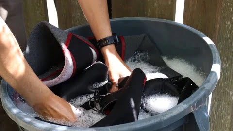 Neoprene Niceties. Turn your suit inside out and open zippers. Wash in a tub of cool or tepid water with neoprene cleaner, baby shampoo or Woolite. Hang on a wide hanger to dry and store flat.(No washer, dryer or sunlight)